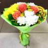 Хризантемы и розы в сочетании с зеленью, дают потрясающий вид букету. Такой букет прекрасный подарок на юбилей, День Рождение или просто так.